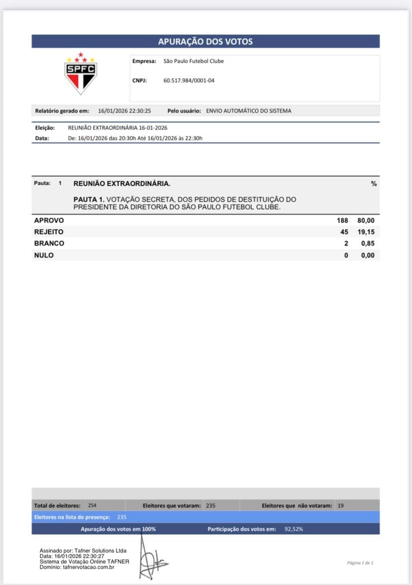 A decisão representa um dos momentos mais delicados da história recente do São Paulo. A crise política gerou forte repercussão entre conselheiros, torcedores e no ambiente interno do clube.