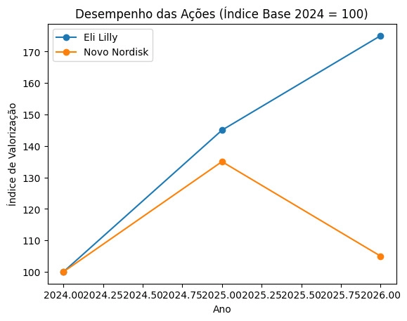 Desempenho relativo das ações – índice base 2024 = 100