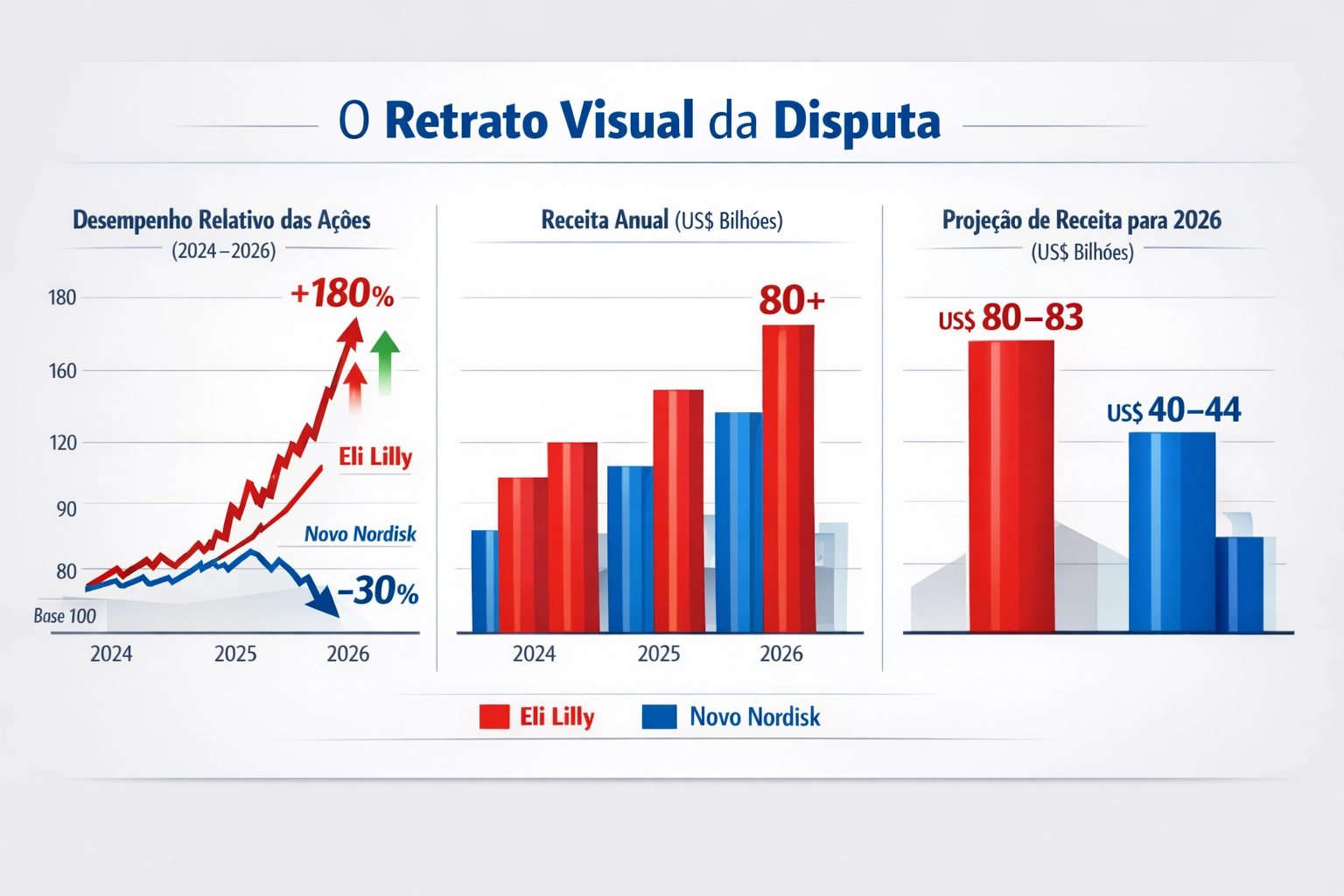 O comparativo de projeções para 2026 escancara o descompasso: a Lilly projeta expansão agressiva; a Novo sinaliza cautela, retração e necessidade de ajustes estratégicos.